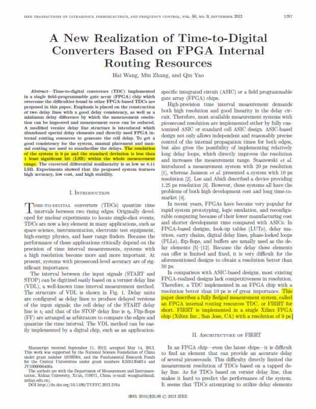 2013年9月,王海以第一作者在《IEEE超声、铁电与频率控制》(IEEE Transactions on Ultrasonics, Ferroelectrics, and Frequency Control)上发表的论文,将测量分辨率提高到了9皮秒;2015年10月,王海准备的学术论文中,其测量分辨率是7皮秒,目前已经投稿了《IEEE电路与系统I》(IEEE Transactions on Circuits and Systems I);而在今年3月,王海终于把时间间隔测量的分辨率,推向了0.5皮秒这个极限值。