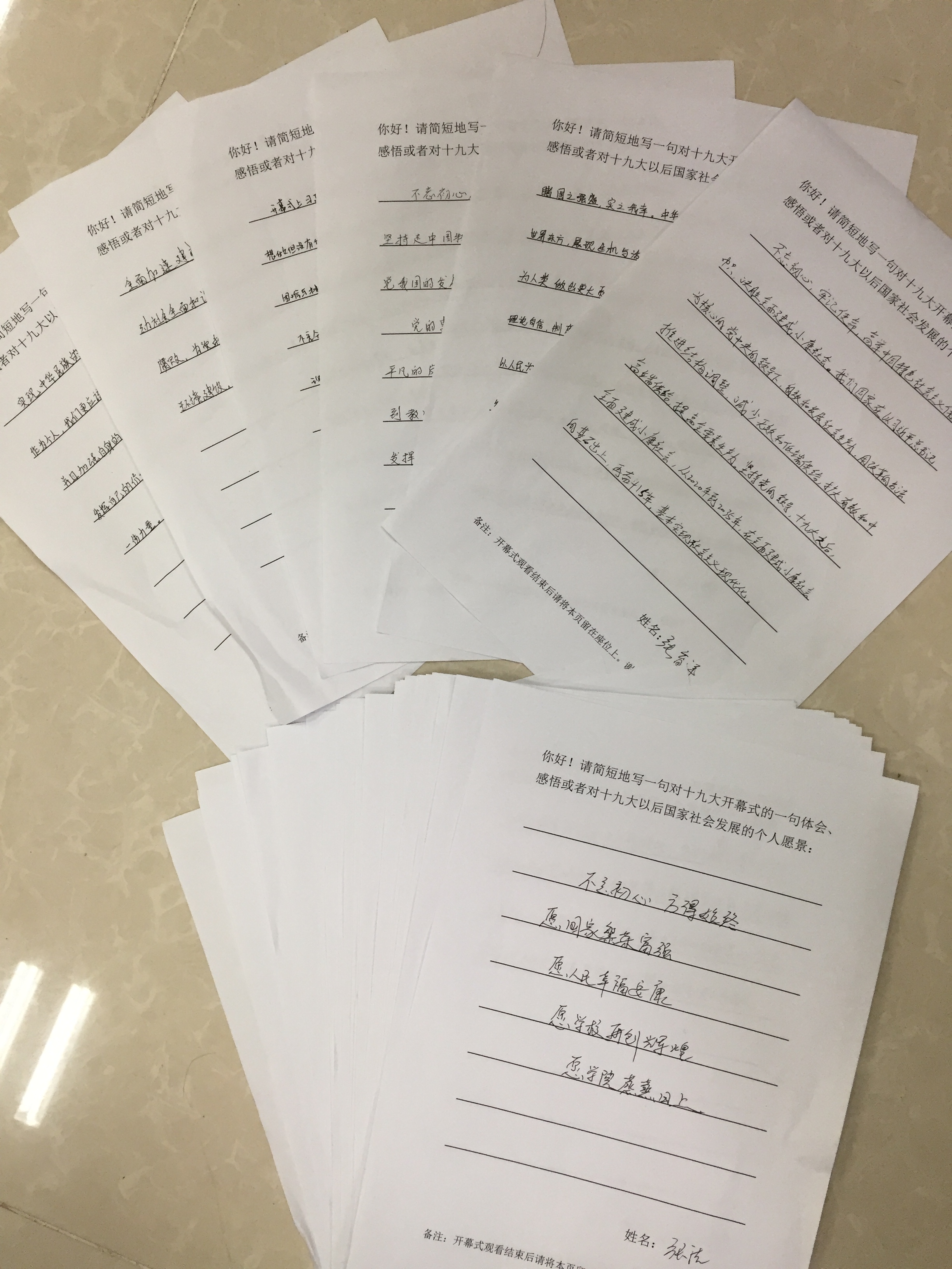 开幕会结束后,老师和同学们围绕习近平总书记向大会做的报告进行了交流,畅谈了观后感受,并写下了个人体会、感悟和对十九大以后国家和社会发展的愿景。