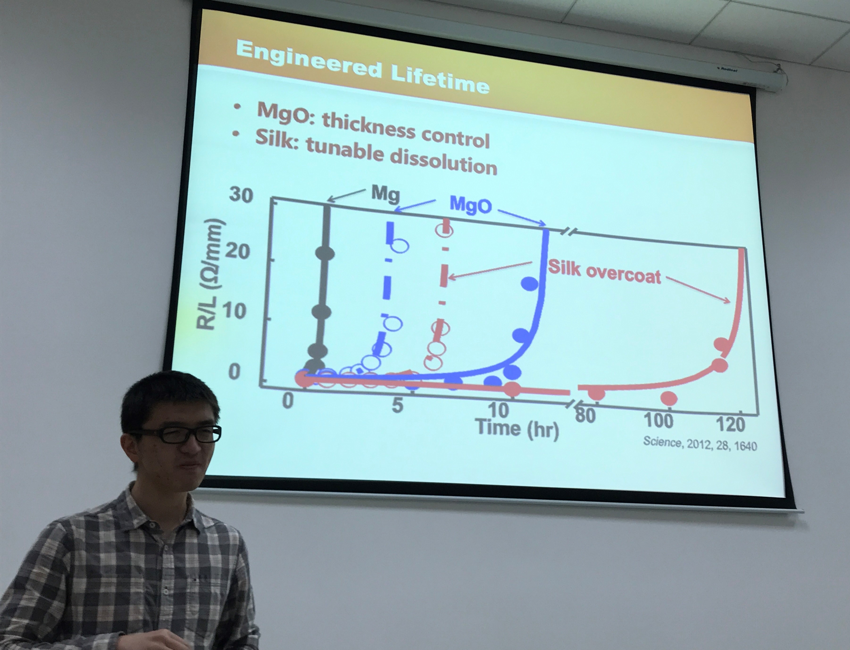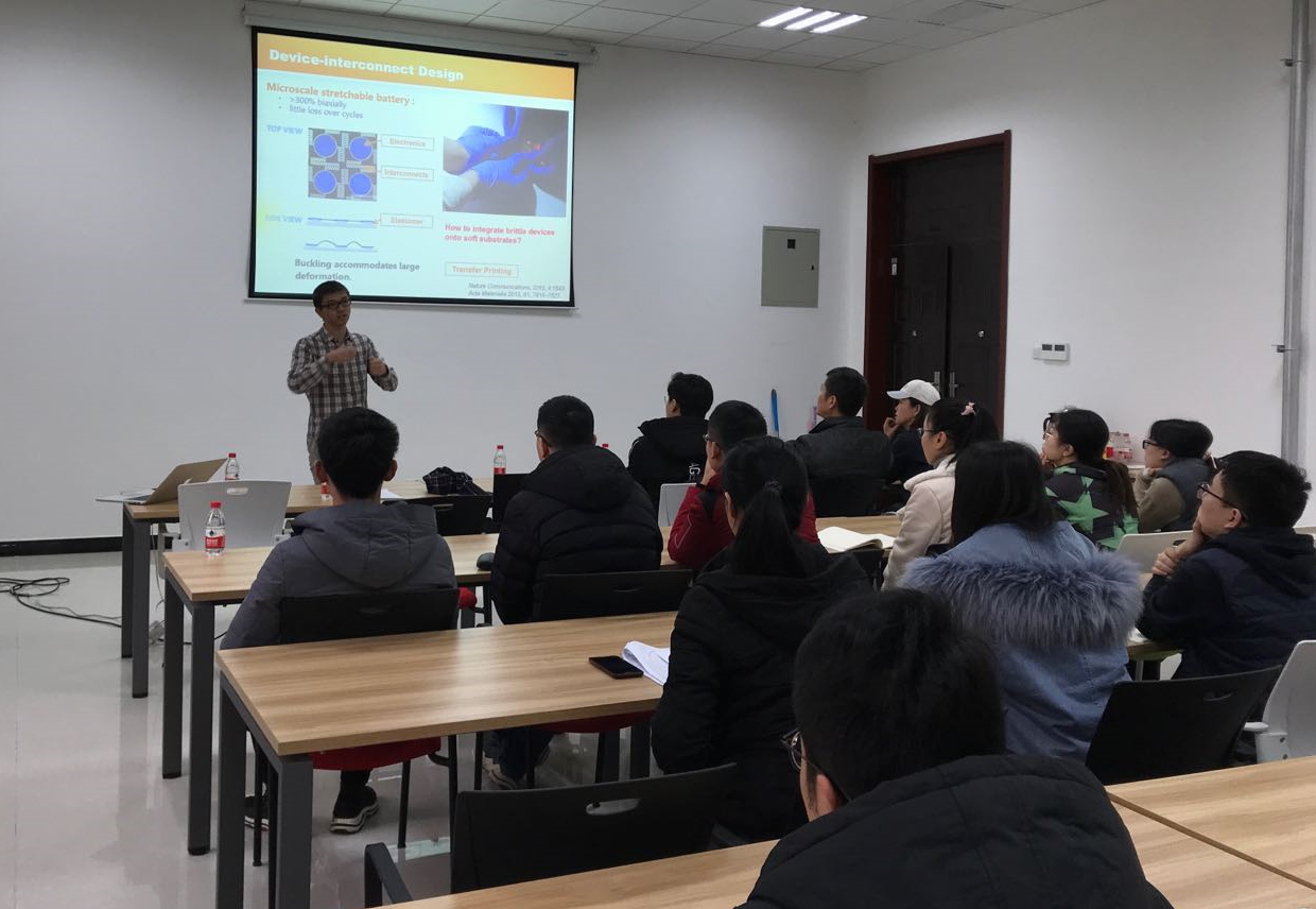报告中,程博士介绍了自己及其团队在可降解柔性医学器件的设计、制造等方面的研究成果,内容丰富精彩。程博士先后讲解了仿生柔性复合材料、具有高谐振频率的超薄石墨烯压力传感器、用于检测心脏健康的阻抗断层扫描装置和体内可降解的电子器件等研究内容,结合详实的理论分析和实验研究证明了其可行性,并从多方面讲解了可降解的柔性医学器件的实用性与多功能性。该成果有望解决传统的医疗植入电子器件存在着需要二次手术取出和与人体复杂曲面不兼容这两大问题,为生物医用材料和检测设备的发展提供新的研究思路。程博士报告结束后,与师生们进行了热烈的讨论与交流,针对大家提出的问题,程博士给出了详细的回答。