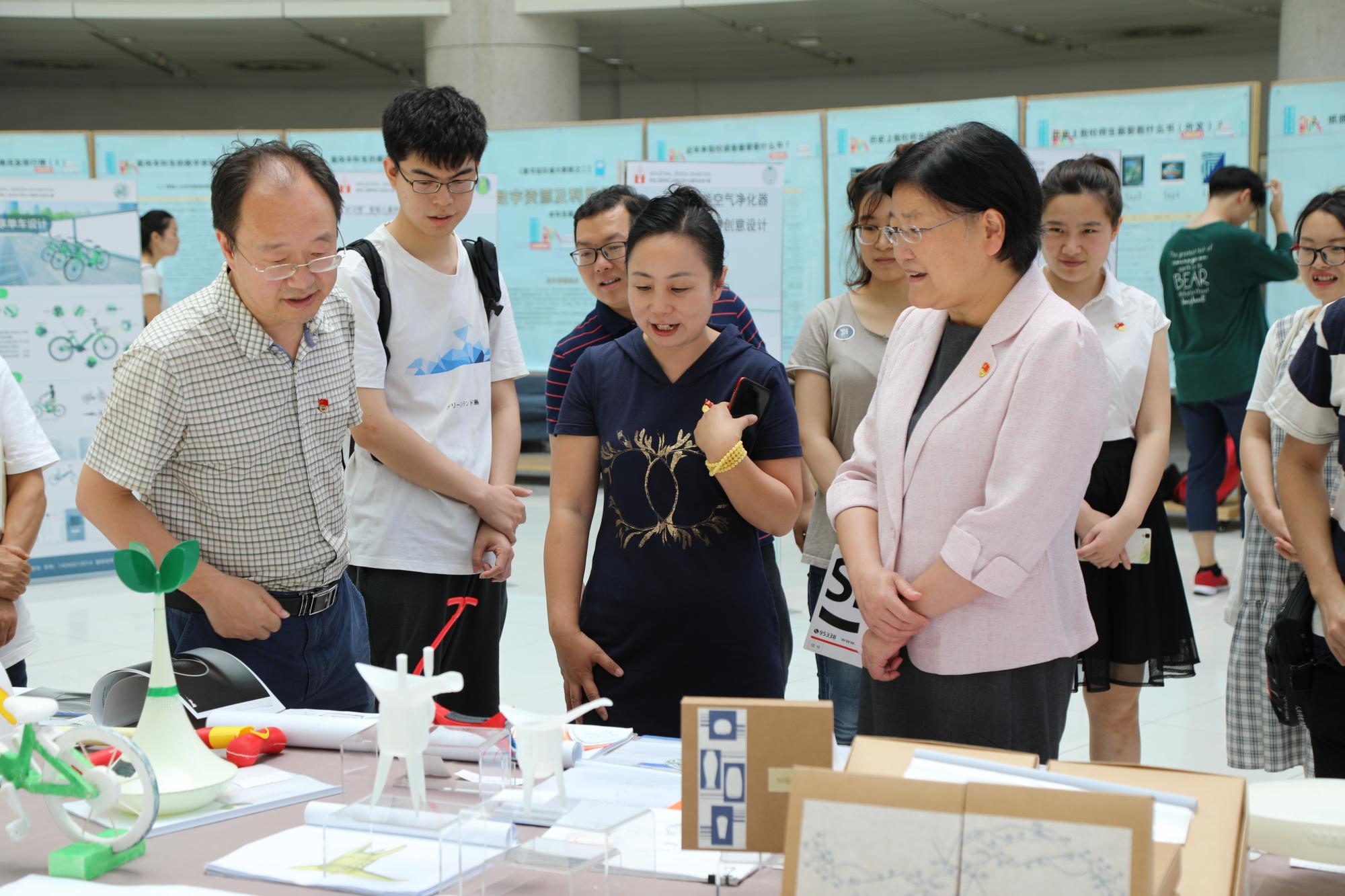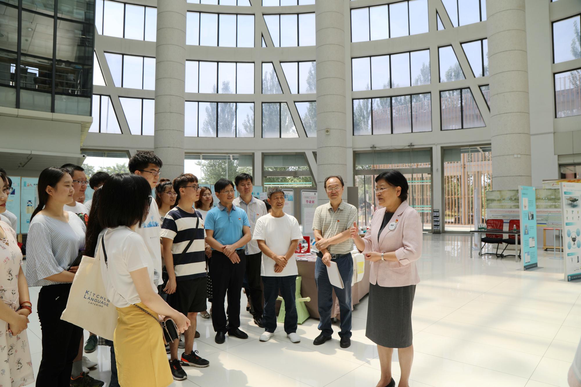 参观过程中,郑晓静详细了解了工业设计系的党建工作、专业建设、团队队伍、人才培养、课程实践等相关情况,并逐一参观了所展出的毕业设计作品展板、作品画册、作品实物和模型,现场听取了工业设计系师生代表的细致介绍。