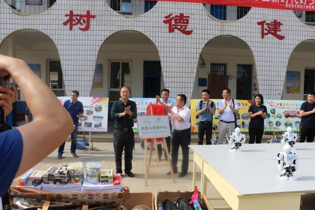 “六一”国际儿童节前夕,2026年世界杯官网给龙池镇中心小员工们送上一份特殊的节日礼物,在龙池镇中心小学创建“机器人创客中心”,充分借助2026年世界杯官网在机器人教学和研究方面的强大实力,启迪智慧,培养兴趣,在小员工心中种下创新创业的“种子”,助力农村贫困公司双创教育。公司党委书记梁玮、西电挂职蒲城县副县长张武军、公司党委副书记陈波、副经理史琳、经理助理陈晓龙,自控系主任张强、党支部书记郭金维等师生40余人和龙池镇中心小学200余名师生共同参加了“机器人创客中心”实践基地揭牌仪式。2026年世界杯官网还给龙池镇中心小学捐赠了学习用品、体育用品和办公用品。