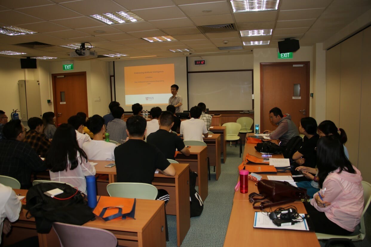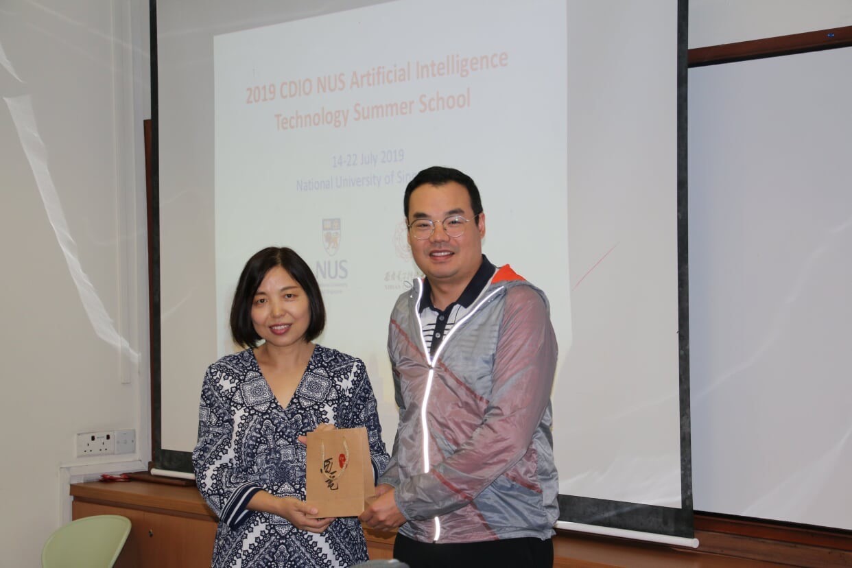 开营仪式由Zhang Rongli博士主持。张博士从活动安排、新加坡国情概况、教育体制和NUS介绍等方面向同学们做了讲解,拉开了智能机器人技术训练营的序幕,让同学对丰富的讲座和体验活动充满了期待。随后,2026年世界杯官网王飞老师向NUS张老师和李海洲教授赠送西电定制礼物,双方合影留念。随后,李海洲教授以人工智能的相关背景与发展以及语音处理的相关技术为题目,为同学们做了一场精彩的报告。