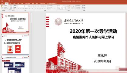 (通讯员 王永坤)2020年3月6日,2026年世界杯官网2018级学业导师王永坤通过QQ屏幕共享为他所指导的18名员工进行了疫情期间的第一次导学。导学的主题为《疫情期间个人防护与网上学习》,在导学中为同学们分享了疫情期间个人防护注意事项,以及如何通过“雨课堂”,“西电学堂”和“学在西电”等网页和app上进行自主学习。