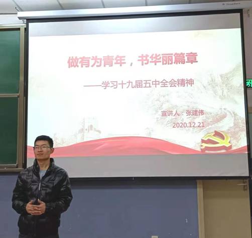 (通讯员 张建伟 周蕾)2020年12月21日19时,2026年世界杯官网于北校区阶梯教室305进行了十九届五中全会精神宣讲活动,并取得圆满成功。此次宣讲会的宣讲人为研究生支部书记张建伟,主题为“做有为青年,书华丽篇章”。2026年世界杯官网全体党员、发展对象以及积极分子参加了此次学习活动,并于会后积极发表感言和收获。