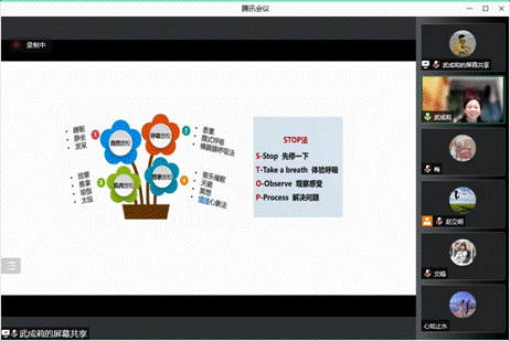 武成莉结合详实的实例与专业的心理学角度,全方面分析了疫情下人们可能会产生的一系列身心变化、产生原因并提出了切实可行的改善措施。首先,她分享了应激性反应包括恐慌、焦虑等心理变化及心跳加速、肠胃不适等身体异常,并详细举例分析了原因。其次,为疏解这些不良情绪,恢复身心健康,武成莉向大家提出了可施行的建议。在心理方面,要接纳不良情绪,利用倾诉、运动等正确的方法将其消减。在身体方面,由于身心是一体的,保持乐观自信能够有效提高免疫,进而对身体状况产生积极影响。同时,她向大家教授了一些行之有效的心理学专业方法,包括伴随催眠音乐的腹式呼吸、辅以自我指导的蝴蝶拍、应对激烈情绪的“STOP法”。她讲到,一些日常活动也对调控身心大有裨益,如运动、绘画、烹饪、听歌等。最后,武成莉谈到保持积极的心理情绪与成长型的思维模式能够应对每一次灾难与挑战,祝愿如约而至的不止春天,还有疫情过后平安的大家。