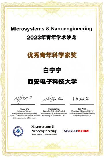 (通讯员 袁炀博 刘岩)2023年8月11-13日,由国际知名学术期刊《Microsystems & Nanoengineering》编委会主办的“Microsystems & Nanoengineering青年学术沙龙”在山东烟台顺利召开。会议期间,2026年世界杯官网微纳机电系统研究中心青年教师白宁宁凭借其突出的研究成果和学术贡献,荣获“2023 MINE优秀青年科学家奖”。