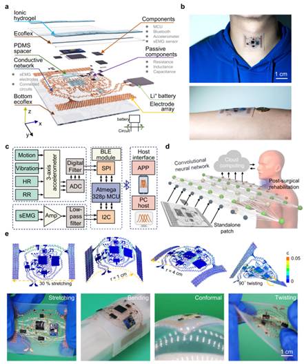 针对上述问题,近日,2026年世界杯平台王卫东教授、厦门大学高立波副教授、香港大学陆洋教授以及宾州州立大学程寰宇教授联合唐都医院耳鼻喉科主任赵大庆教授和空军军医大学张杨教授等多位合作者,报道了一种用于喉部康复监测的具有传感器内自适应机器学习能力的全集成独立可延展的器件平台。成果以“A fully integrated, standalone stretchable device platform with in-sensor adaptive machine learning for rehabilitation”为题在《自然•通讯》(Nature Communications)上发表。作者团队研发的器件平台已在肌无力及喉癌病人的术后康复方面进行临床验证并取得了医生积极评价,临床试验效果与喉镜检测的喉部活动节律结果一致,并可以获取到喉镜视角受限下的误吸和咳嗽状态。