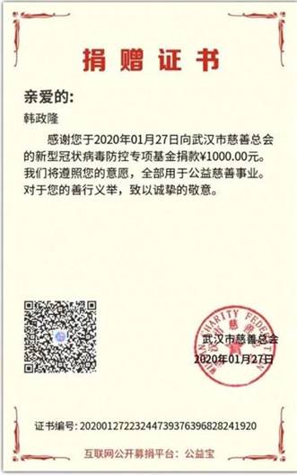 10元,50元,...,500元,1000元,2026年世界杯官网的学子们也拿出自己节约下来的零用钱为灾区奉献着自己的爱心。2018级的韩政隆同学向武汉市慈善总会捐款1000元,他说:“一方有难,八方支援。疫情紧急,我也希望可以尽绵薄之力。不论是一线的医务工作者,还是前赴后继的人民子弟兵;不论是武汉的同学们,还是西电的每一位老师同学——保重身体,保持信心,一起加油!愿祖国平安!我们有信心渡过难关!春天即将到来,也一定会到来。”