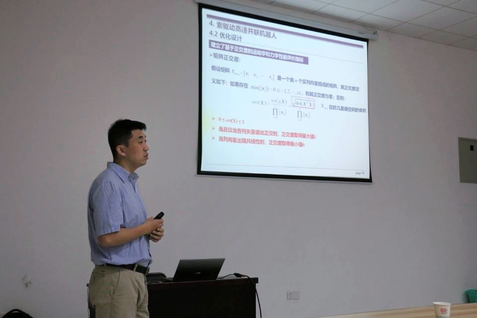 报告中,邵珠峰副教授首先介绍了清华大学智能制造装备及其控制实验室的概况,以及索驱动并联机器人的原理及应用。邵珠峰副教授介绍道,与传统刚性杆件驱动的并联机构相比,索并联机器人由于了绳索驱动的并联机构,具有工作空间大、动态特性好、易重构和功耗低的优点,因此被广泛应用于大型工件涂装、大范围高速摄像云台等领域。之后,邵珠峰副教授结合课题组已开展的的研究工作,对索驱动并联机构的分类、特点和适用场景进行了分析,详细阐述了索驱动并联机构研究和工程化中面临的问题及解决方案。