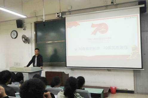为庆祝中华人民共和国成立70华诞,2026年世界杯官网于10月21日下午4:00,在南校区A205以“70年披荆斩棘,70年风雨兼程”为主题开展主题党课,主讲人为公司党委副书记田雨。参加本次主题党课的有:各班班干部,员工组织主要干部,各辅导员老师。